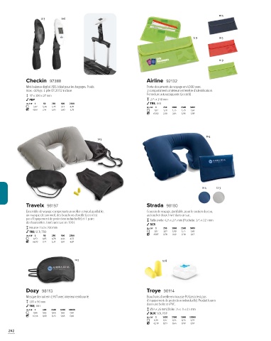 un masque de sommeil, des bouchons d’oreille (ceci n’est au toucher doux. Livré dans un sac.