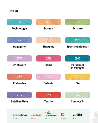 Index index 07 45 69 Technologie Bureau Ecriture 97 131 155 Bagagerie Shopping Sports et plein air 173 215 241 Drinkware Home Personnel et Voyages 265 277 289 Porte-clés Enfants Eté 297 311 342 Soleil et Pluie Textile Connect’in 56 242 278 326 312