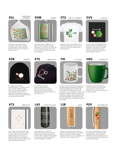 L’embossage consiste à reproduir des La gravure laser est la méthode Utilisation d’un faisceau laser de haute Le processus de sérigraphie est idéal
